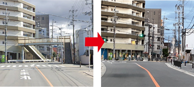 狭い歩道に橋脚・階段が立つことから、歩道の通行の妨げとなっていた歩道橋。